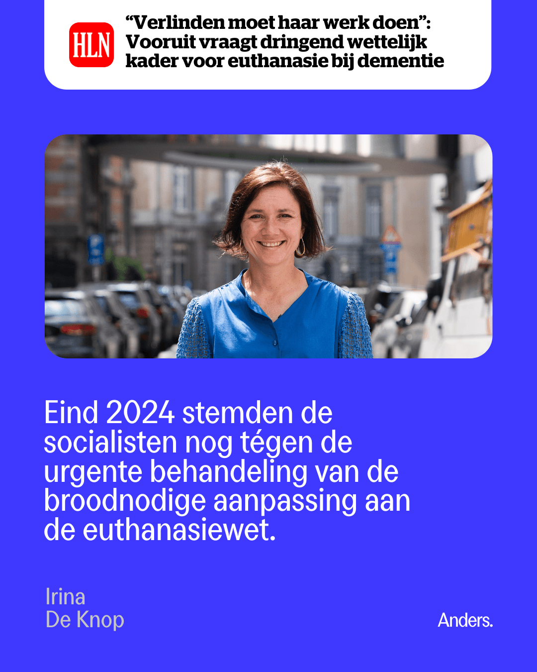 Daarom zette Irina De Knop (Anders) haar wetsvoorstel opnieuw op de agenda van de Kamer. Het voorstel breidt de euthanasiewet uit, in lijn met het advies van het Belgisch Raadgevend Comité voor Bio-ethiek, en gaat verder dan dementie alleen.